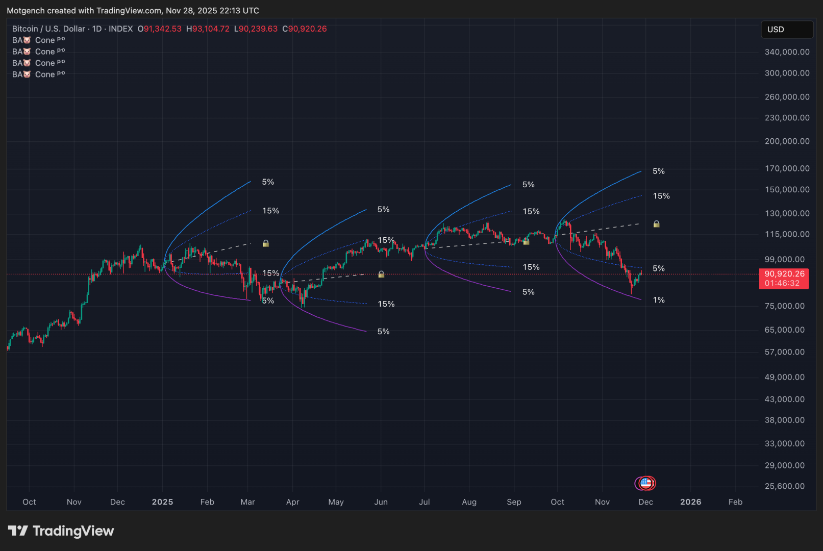 Probability cone can be offset for any number of bars as well as locked to its current position so it doesn’t move as new data arrives.