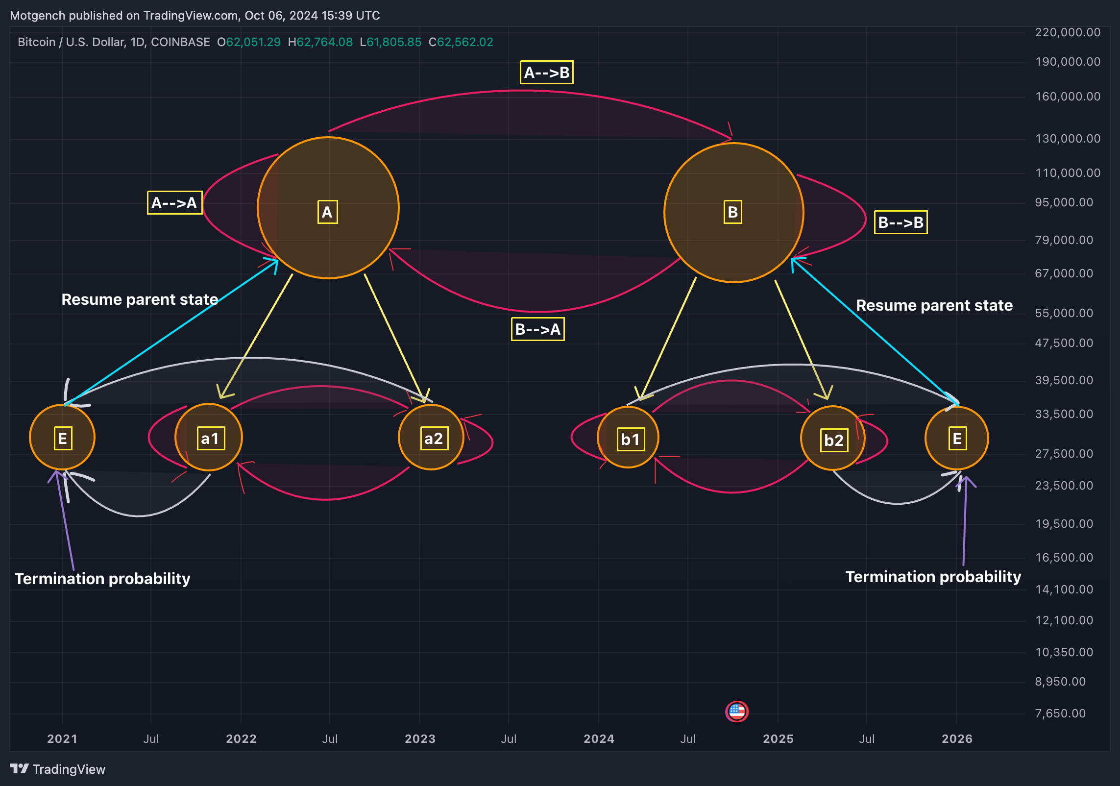 The state dependent probability cone is the full visual depiction of the models current expectation about the future price movements, based on the currently observed data, the current state and the most likely future transitions between states.